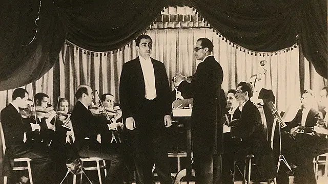 روح الله خالقی(رهبر ارکستر)،مرتضی محجوبی(پیانو)،ابوالحسن صبا(ویلون)،غلامحسین بنان(خواننده)